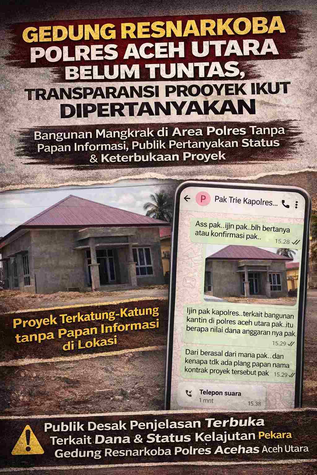 Spread the loveGedung Resnarkoba Polres Aceh Utara Belum Tuntas, Transparansi Proyek Ikut Dipertanyakan Aceh Utara – Pembangunan gedung baru Satresnarkoba Polres Aceh Utara menjadi perhatian setelah hingga kini kondisi bangunan tersebut disebut belum rampung. Sorotan publik juga mengarah pada aspek keterbukaan proyek, menyusul tidak ditemukannya papan informasi pekerjaan di lokasi. Dari hasil pantauan wartawan, bangunan yang berada di lingkungan Polres Aceh Utara itu tampak masih dalam tahap penyelesaian. Kondisi tersebut memunculkan tanda tanya, terutama terkait progres pekerjaan, sumber anggaran, serta pihak pelaksana proyek. Awalnya, bangunan itu sempat diduga sebagai fasilitas lain di kawasan Mapolres. Namun setelah dilakukan konfirmasi, Kapolres Aceh Utara AKBP Trie menjelaskan bahwa bangunan tersebut diperuntukkan sebagai gedung baru bagi Satuan Reserse Narkoba. Menurut penjelasan Kapolres, pembangunan gedung itu bersumber dari anggaran pemerintah daerah Kabupaten Aceh Utara. Ia juga menegaskan bahwa proyek tersebut bukan dimulai pada masa kepemimpinannya, melainkan telah berjalan sejak pejabat sebelumnya dan hingga kini belum memasuki tahap serah terima kepada pihak Polres Aceh Utara. Kapolres menyebut bangunan tersebut masih menunggu kelanjutan proses penyelesaian. Informasi yang diterimanya, proyek itu berpeluang memperoleh tambahan pekerjaan lanjutan agar dapat segera difungsikan. Di sisi lain, ketiadaan plang proyek di lokasi ikut menambah perhatian masyarakat. Sebab, papan informasi biasanya menjadi bagian penting untuk menunjukkan identitas proyek, nilai anggaran, sumber dana, serta nama kontraktor pelaksana. Seorang pejabat internal yang turut memberikan keterangan kepada wartawan menyebut nilai anggaran pembangunan gedung itu berkisar sekitar Rp500 juta dan berasal dari APBK Aceh Utara melalui sektor teknis di lingkungan Perkim. Namun, untuk detail perusahaan pelaksana, ia mengaku tidak mengetahui secara pasti dan menyarankan agar hal tersebut ditanyakan langsung kepada instansi terkait. Situasi ini membuat publik berharap adanya penjelasan lebih rinci dari pihak berwenang, terutama menyangkut status pekerjaan, waktu penyelesaian, serta keterbukaan data proyek. Transparansi dinilai penting agar pembangunan fasilitas publik, apalagi yang berada di lingkungan penegak hukum, dapat berjalan akuntabel dan tidak menimbulkan spekulasi di tengah masyarakat. (Jihandak Belang) Post Views: 36 Navigasi pos Tri Adhianto: Pembatasan Media Sosial Anak di Bawah 16 Tahun Perlu Dukungan Orang Tua Mengabadikan Nama dr. Karneni: Penghormatan bagi Pionir Kesehatan Tulungagung